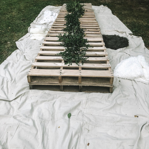 I kept everything pretty simple, but wanted a few special things! We were taking a chance with the weather, it kept changing its mind every couple hours. But keeping it outdoors was the goal. I wanted to change up the usual table and chairs and found this post on Pinterest. I loved the idea of the wooden palettes, such a cheap option for table and chairs! Nate power washed them off and they were like new. We bought a painting drop cloth for the bottom. I really wanted to get some pillows, but in the end, just didn't have time, so I just put some fuzzy and fur blankets out there to add some texture. My mom made the garland out of boxwoods and tied them together. She added a little babies breath for a little color. I probably should have gotten flowers but since it had looked like rain I just opted for the bare minimum! We strung some battery-powered lights thru the garland and it looked so pretty as it got dark outside! I also put some of these mini tea lights out!